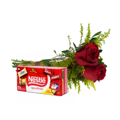 BUQUÊ DE 2 ROSAS VERMELHAS COM CAIXA DE BOMBOM